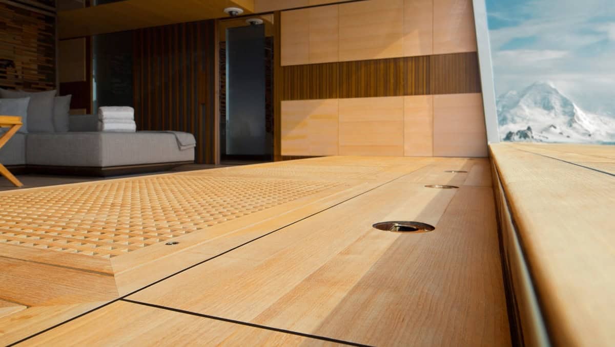 TESUMO was developed as part of a research project conducted by Lürssen Shipyard and the German University of Göttingen with the aim of creating an alternative to teak for use as a high-quality wooden deck for yachts.