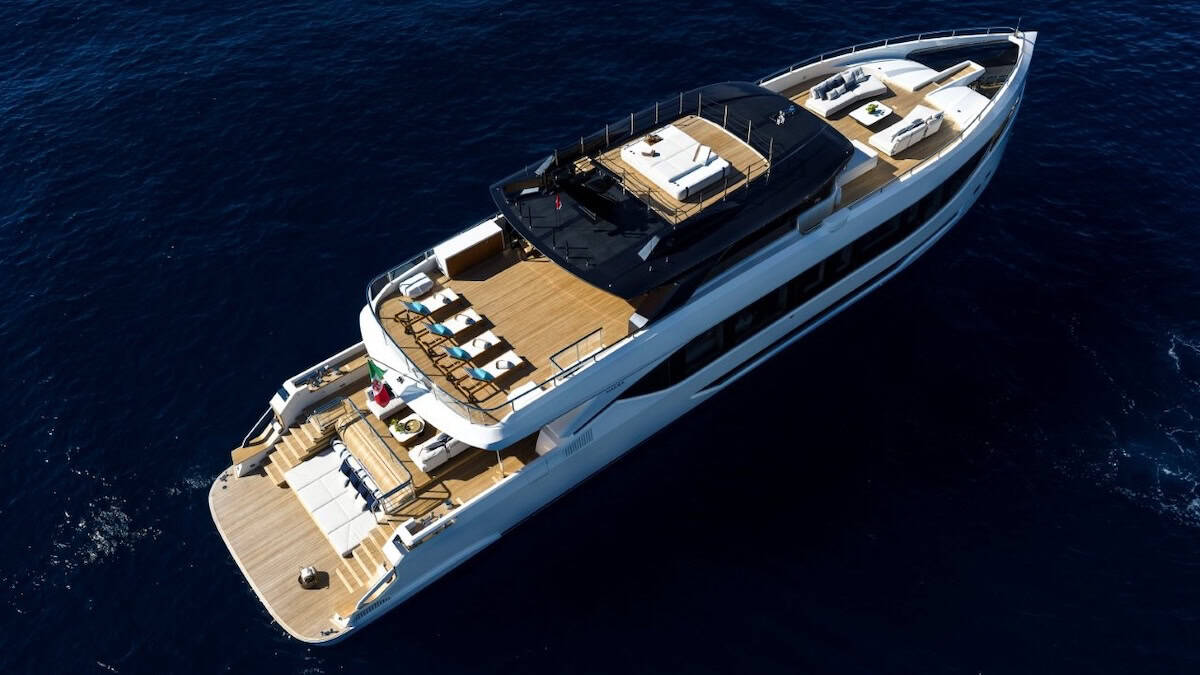The project stems from a dual objective: on one hand, aligning the aesthetic with the shipyard’s new direction, providing a strong visual presence that gives the yacht an imposing character; on the other, increasing onboard livability and comfort by introducing solutions such as the full-beam bow and a redesigned stern.